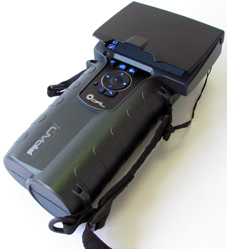 Ergonomically designed for comfortable single hand operation. Carried by a padded shoulder strap. Turn on, aim, shoot and store video clips and still pictures.